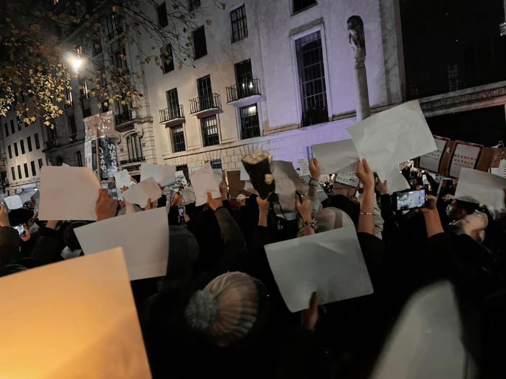 那一陣子的記憶是緊張而模糊的。學校裡的海報經歷著不斷迭代,從一個人的聲音到中性筆留下的中文字樣的對壘,從對Bridge man的聲援到對校方不公正處理方式的指控。第一次張貼有政治主張的海報,第一次走上街頭,第一次面對一雙雙眼睛說出那些曾經只存在於我和朋友間私下的暗語。我竟然是在現在回想時才感到這一樁樁的艱難,因為彼時從無時間去多想,只有每一刻都在被內心的火焰燃燒。我甚至記不清「白紙運動」爆發的那一個時間點了,但我記得學校的公告欄上掀起了再一個小高潮,還有11月27日倫敦中國大使館前的集會,我第一次見到那麼多中國留學生——以那樣一種奇異的心情。