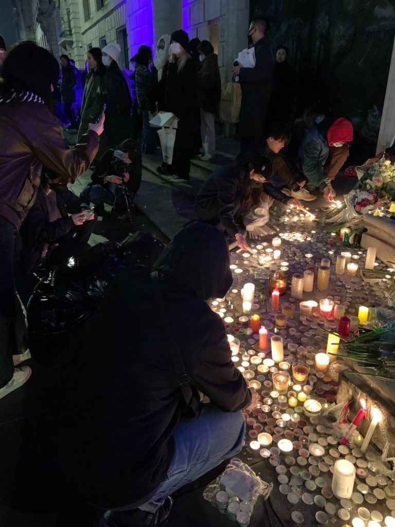 廖女士:2022年11月27日,我從社交媒體知道當晚倫敦有一場聲援白紙運動的活動,地點在中國駐英大使館。當晚約7點10分,我到達後發現現場有三個地方點了很多蠟燭悼念烏魯木齊大火死去的同胞。我拿著電子蠟燭,周圍很多人也拿著自製的牌子和海報,還有一張張白紙,呼應國內的白紙運動。人越來越多,大使館門口前面的三條過道上都擠滿了人,人群總是一不小心就擠到車道上去了,警察要一遍一遍地提醒我們注意安全,維持秩序忙個不停。現場的演講和發言一直不間斷,口號也一直不停,從人群激昂的聲音中真切的感受到他們的憤怒,我也是其中的一員,並且享受這個過程。